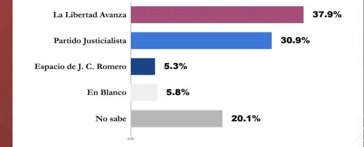 Según esa encuesta, La Libertad Avanza en Salta ganaría con el 37.9%, en tanto que en segundo lugar quedaría el “Partido Justicialista” con el 30,9%. En tercer lugar se ubicaría el espacio del actual senador nacional Juan Carlos Romero con apenas un 5,3%.