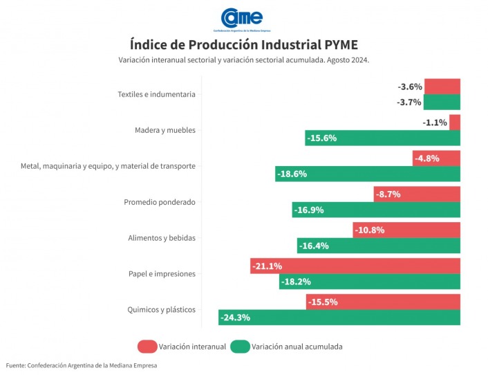 Es que, según un informe del sector industrial, la actividad manufacturera de las pymes cayó 8,7% de forma interanual en agosto. Con ello, la retracción acumulada en los primeros ocho meses del año se ubica en 16,9% frente al mismo periodo de 2023.