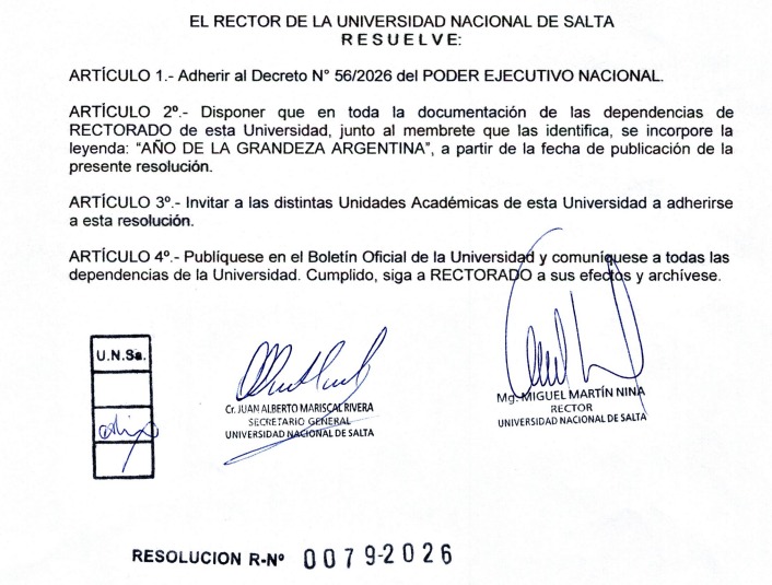 El Rector de la Universidad Nacional de Salta (UNSa), Miguel Nina, ratificó su alineamiento con el gobierno de Javier Milei y dispuso que la documentación oficial de la casa de estudios lleve la misma leyenda que escogió la Casa Rosada para el 2026: “Año de la Grandeza Argentina”.
